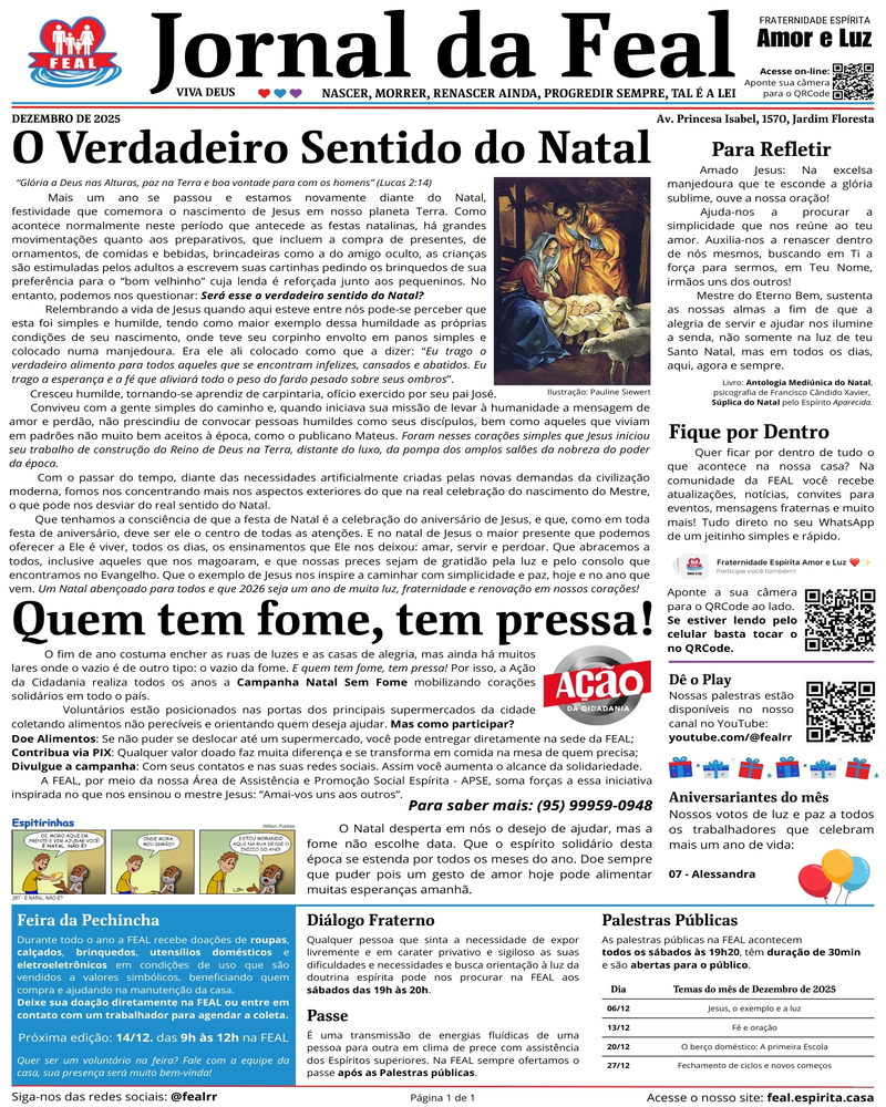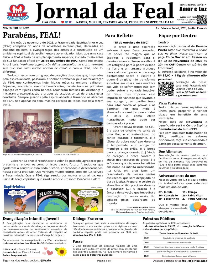 O Jornal da FEAL é um canal de amor e divulgação doutrinária da Fraternidade Espírita Amor e Luz – FEAL. Aqui, você encontra reflexões, notícias, mensagens edificantes e registros das atividades que unem nossa comunidade em torno do Evangelho de Jesus à luz do Espiritismo.