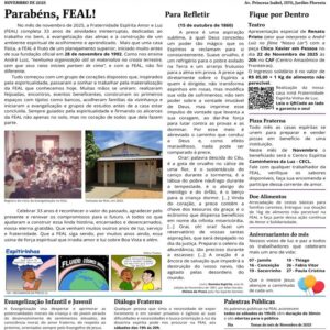 O Jornal da FEAL é um canal de amor e divulgação doutrinária da Fraternidade Espírita Amor e Luz – FEAL. Aqui, você encontra reflexões, notícias, mensagens edificantes e registros das atividades que unem nossa comunidade em torno do Evangelho de Jesus à luz do Espiritismo.